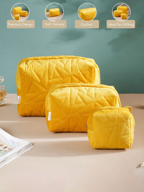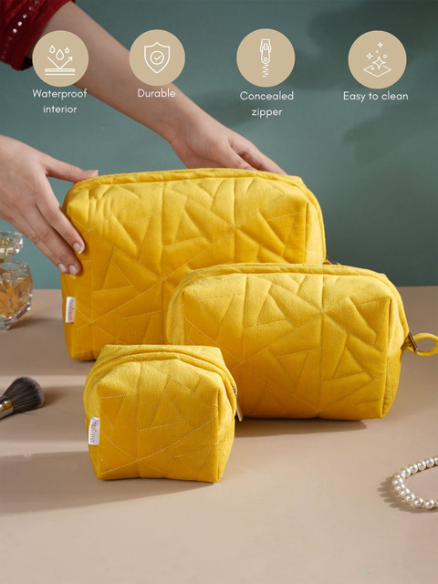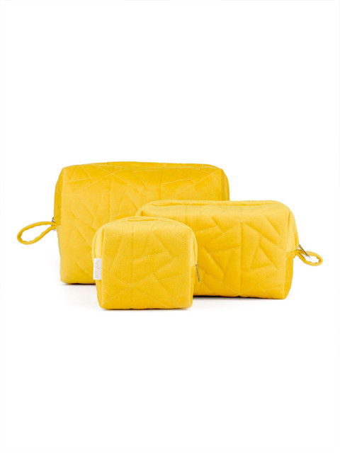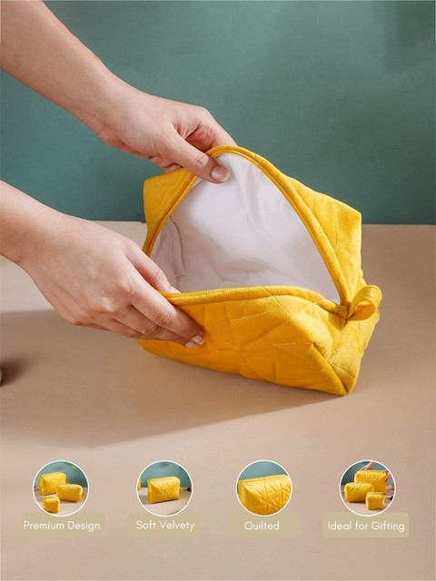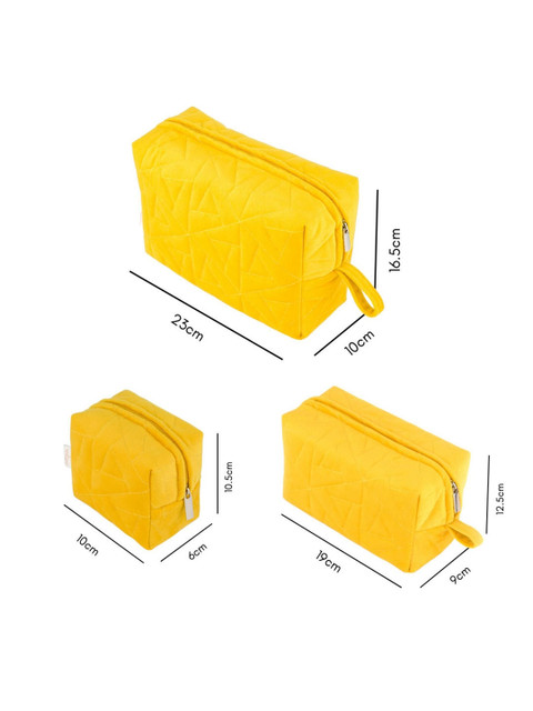 The vanity pouch set of 3 is designed with a soft velvety surface and is detailed with plush textures. The pouches in 3 different sizes have been hand-stitched with expertise to provide ample space to be used as a travel kit or store one’s essentials, be it makeup, stationery, or jewellery. The multipurpose pouches feature a sturdy smooth zipper for more accessible functionality and storage. The 3 pouches have a waterproof lining that ensures that in case of any spillage, no component drains out of the bag. The bright yellow colour of the pouches looks cheerful and adds a ray of sunshine to one’s organising activities.