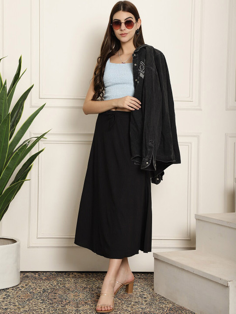 Black solid a-line midi skirt, has an elasticated waistband with slip-on closure, and a flared hem