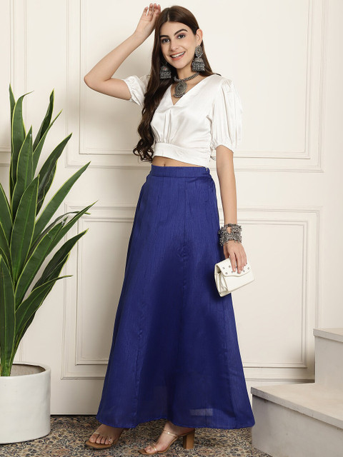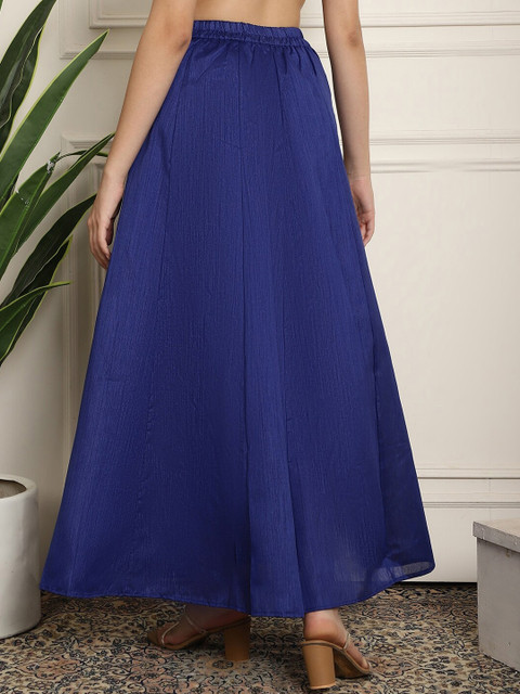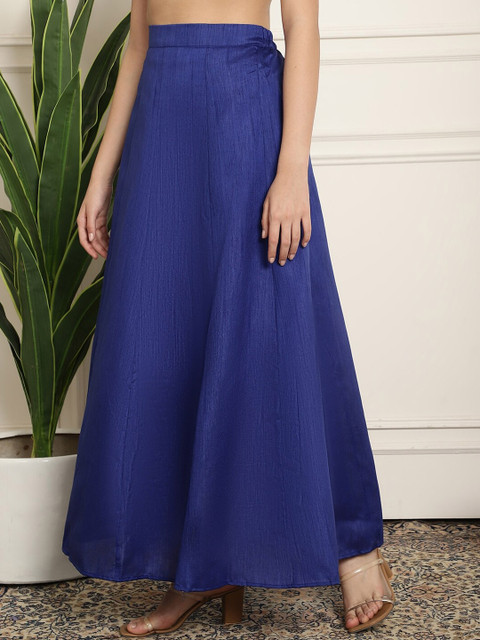 Blue solid flared maxi skirt, has an elasticated waistband with slip-on closure, flared hem & 1 pocket