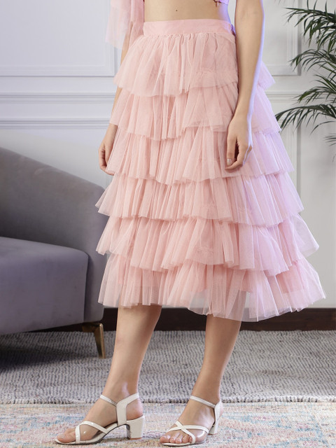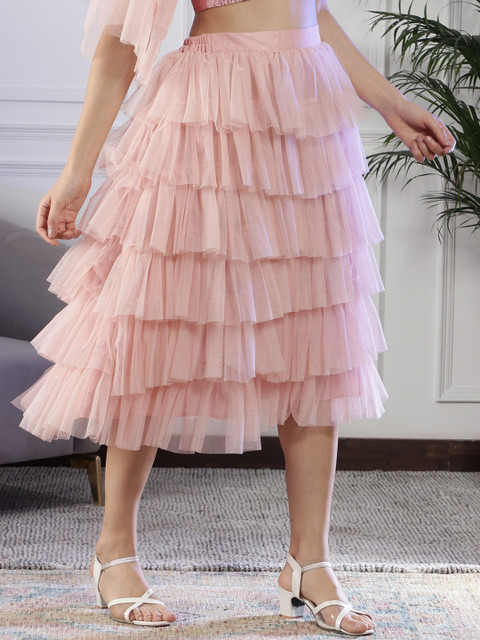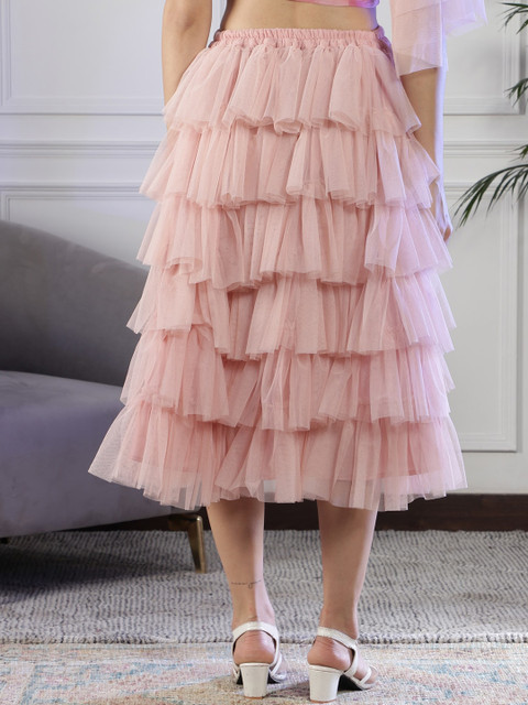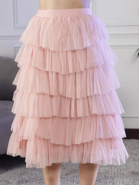Pink solid tiered midi skirt, has an elasticated waistband with slip-on closure, and a flared hem