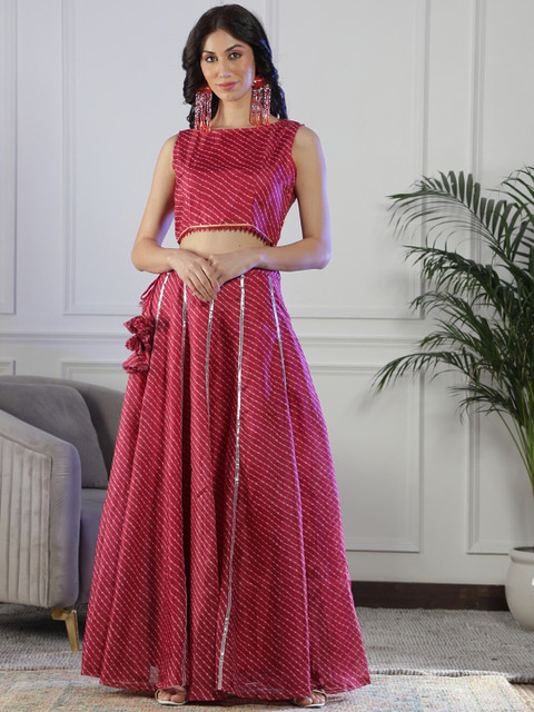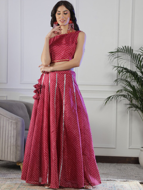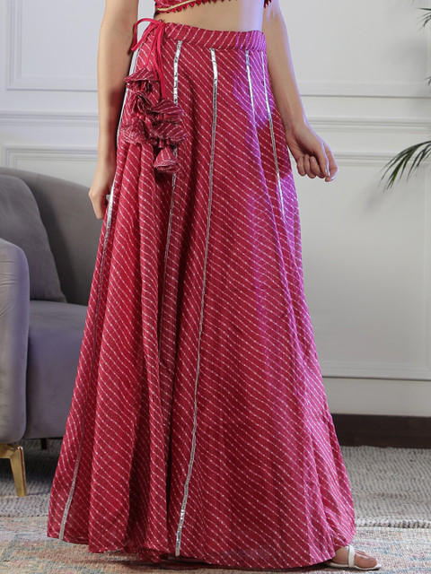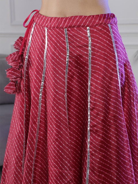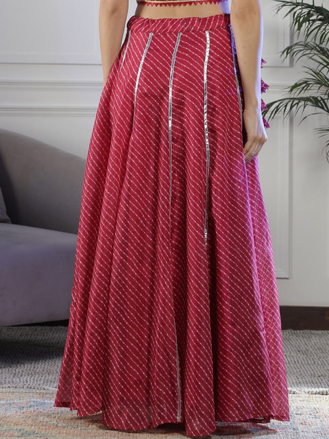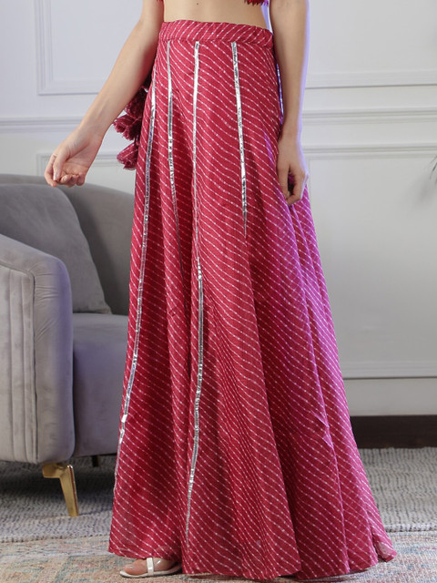Maroon Leheriya printed with gotta-patti detail flared maxi skirt, has an elasticated waistband with slip-on closure, and a flared hem