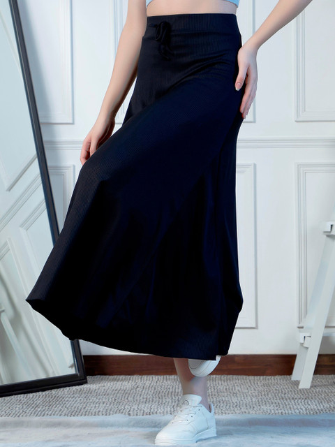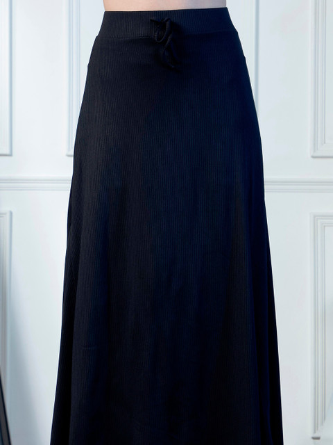 Black solid A-Line maxi skirt, has an elasticated waistband with drawstring closure, and a flared hem