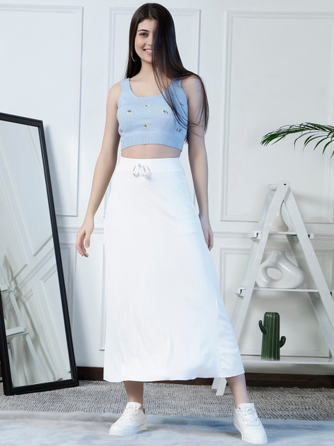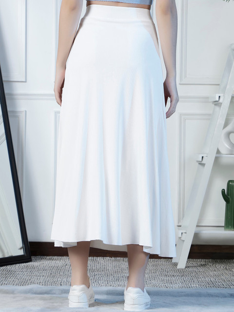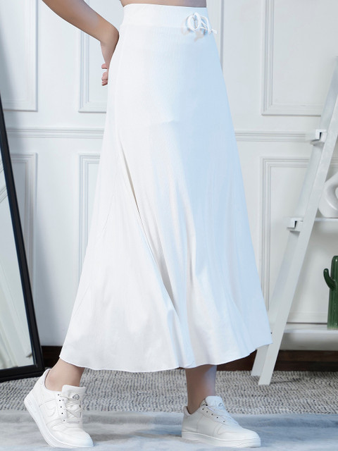 White solid flared maxi skirt, has an elasticated waistband with drawstring closure, and a flared hem