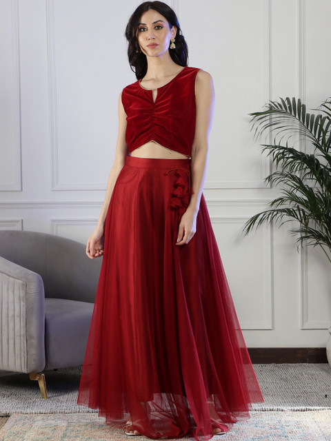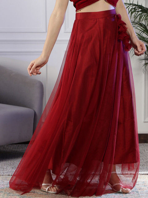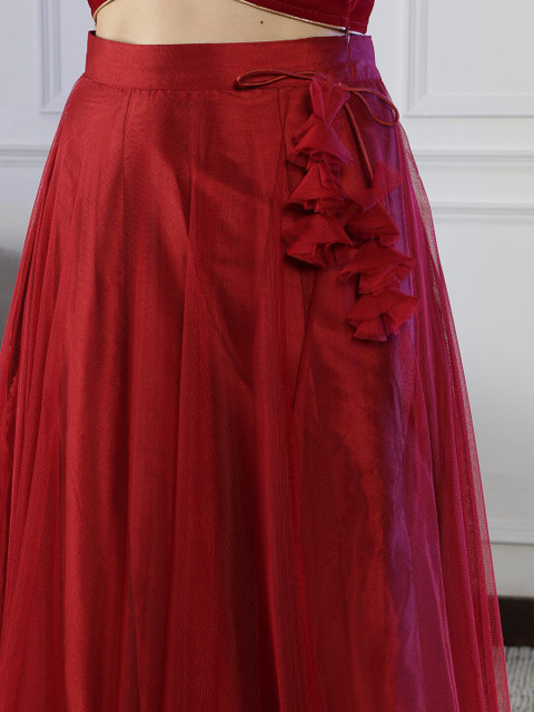 Maroon solid maxi flared maxi net lehanga skirt, has a waist band with zip closure, flared hem, attached lining, and Tassel Details