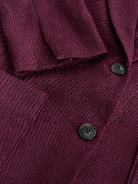 Burgundy solid single-breasted blazer, has notched lapel collar, long regular sleeves, button closure, ventless and 3 pockets