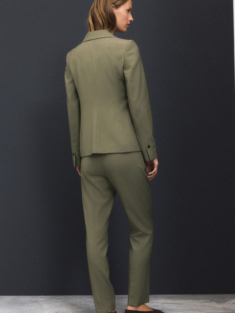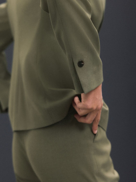 Olive green solid smart casual blazer, has a peaked lapel collar, single-breasted with button closure, long sleeves with shoulder pad, two pockets with flaps and inner lining