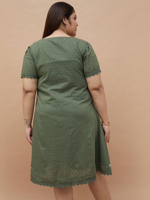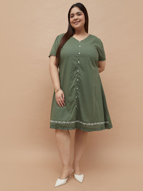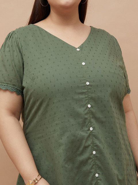 Dobby woven a-line dress featuring a V-neckline and half sleeves.