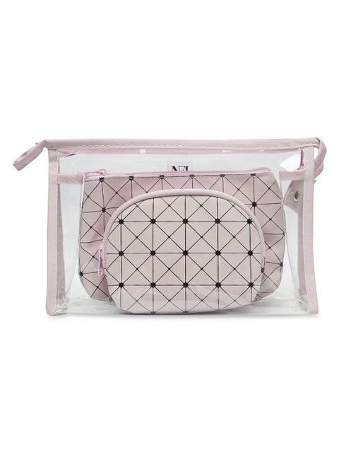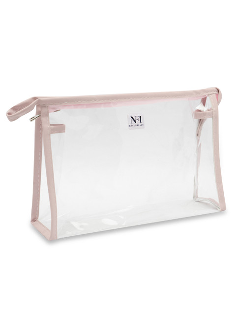Pink and Transparent big cosmetic pouch, has 1 main compartments with zip closure and and 1 handle