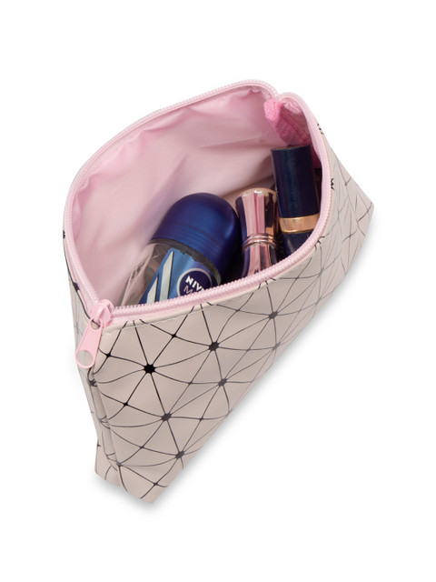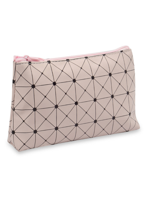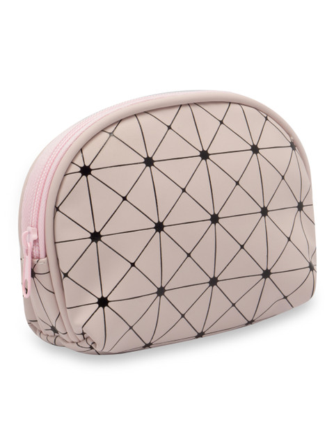 Pink and back printed small cosmetic pouch, has 1 main compartments with zip closure and and 1 handle<
