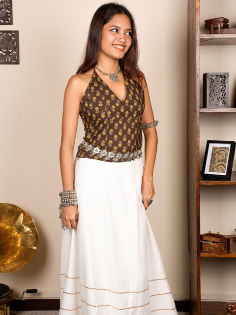 Pair this hand-block floral printed piece with delicate oxidised earrings and comfortable flats for an effortlessly elegant daytime look. For a dressier vibe, switch to statement jewellery and classic juttis. Keep the makeup soft and fresh to complement the natural cotton texture and artisanal charm.
