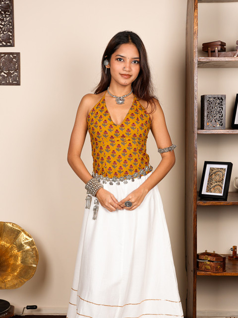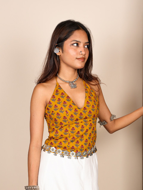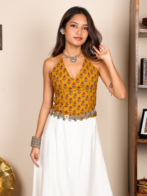 NISHORAMA Women Floral Printed Halter Neck Ethnic Cotton Top
