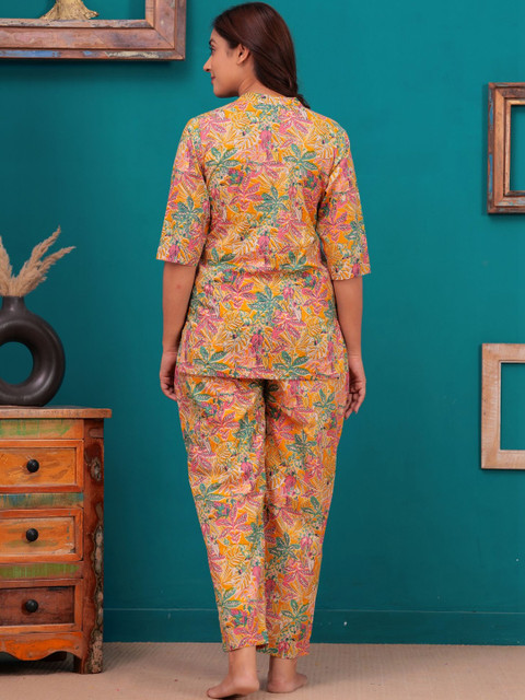 Orange & green printed top, has a mandarin collar-neck and three-quarter sleeves, secured with slip-on closure