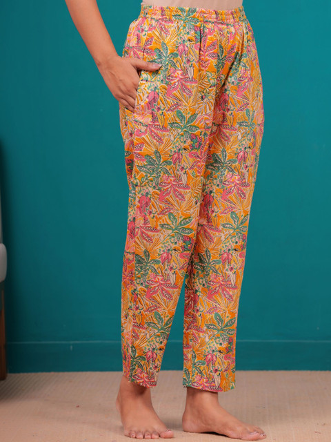 Orange & green printed trousers, has an elasticated waistband with slip-on closure has 2 pockets