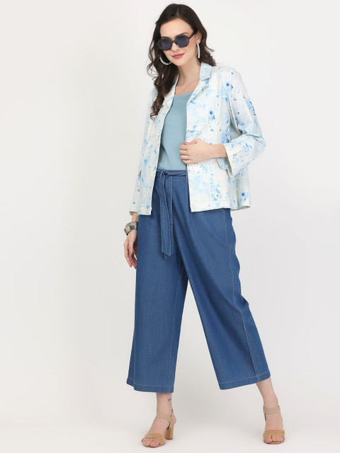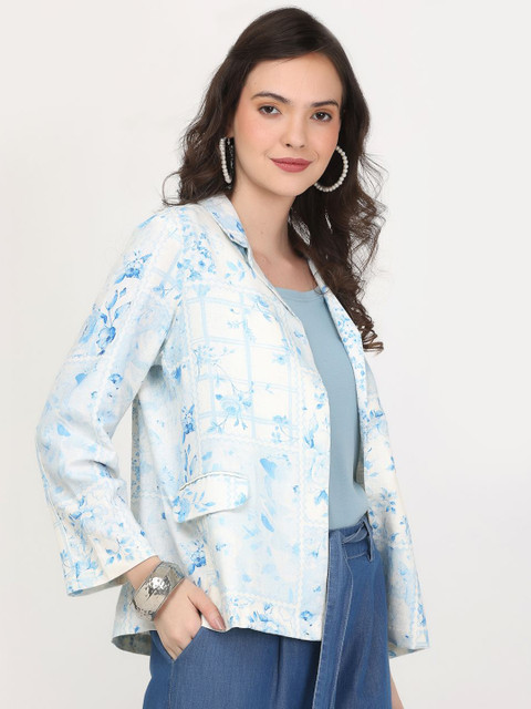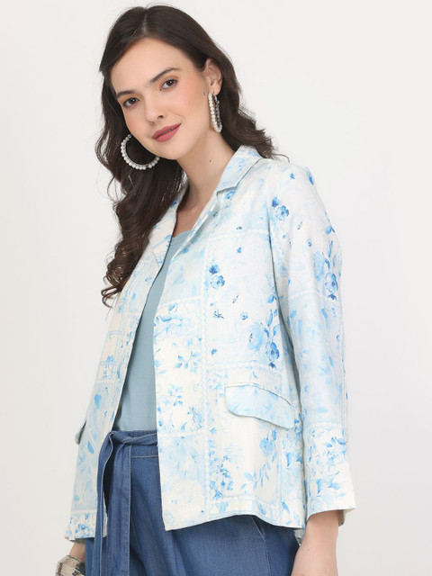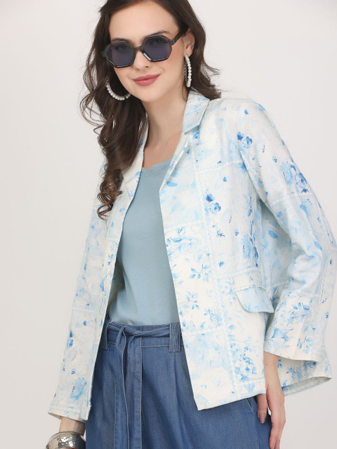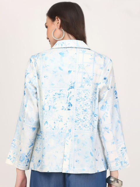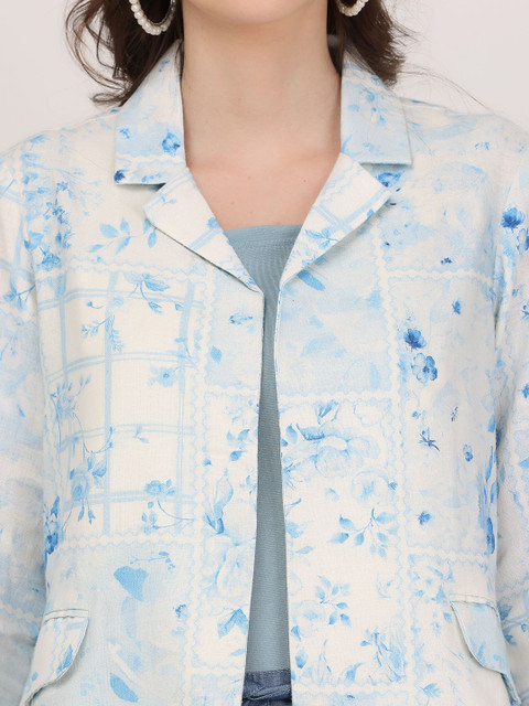 White and blue printed blazer, has a notched lapel, long sleeves, open front, two flap pockets, one welt pocket and a single-vented back hem