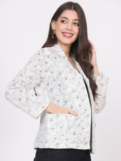 White and grey printed blazer, has a notched lapel, long sleeves, open front, two flap pockets, one welt pocket and a ventless back hem