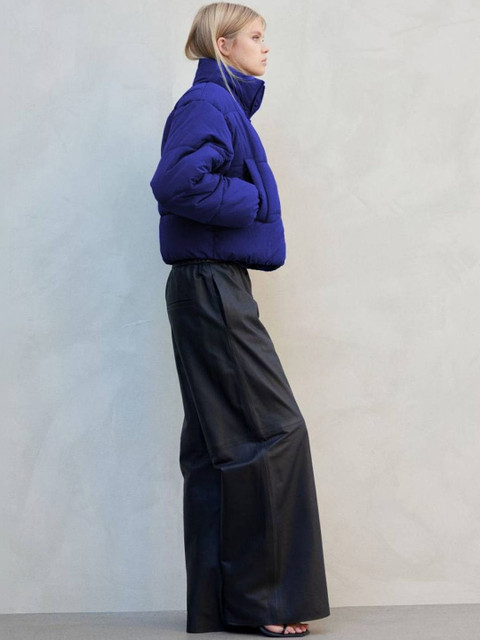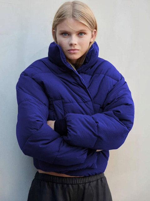 Blue solid lightweight puffer jacket, has a stand collar, 2 pockets ,has a zip closure, long sleeves, straight hemline, polyester lining