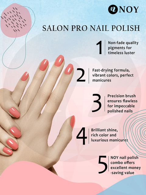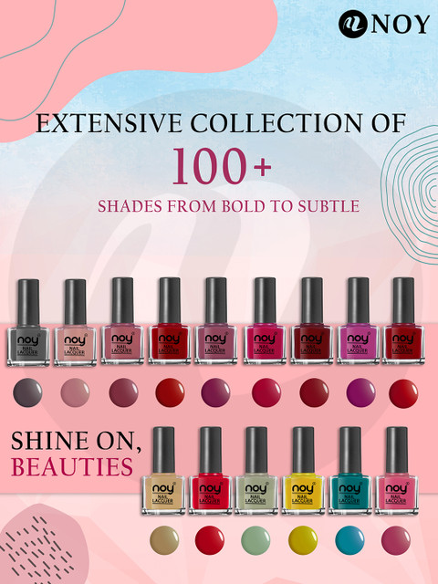 | Special Features | The NOY Nail Paint Pack of 12/13 offers vibrant, high-shine glossy shades that are quick-dry, long-lasting, and chip-resistant, ensuring smooth, salon-quality nails at home.This multi-color nail polish set includes trendy, bold, pastel, neon, and metallic shades, suitable for daily wear, parties, festive occasions, and gifting.Each 6ml bottle provides easy application, flawless coverage, and durable color, making it a perfect nail polish assortment for teens, college girls, working women, and fashion-forward individuals.The included top coat or metallic shades add extra shine and protection, giving your nails a professional, salon-finish look effortlessly |