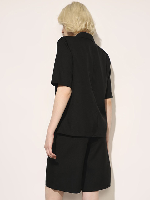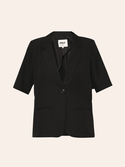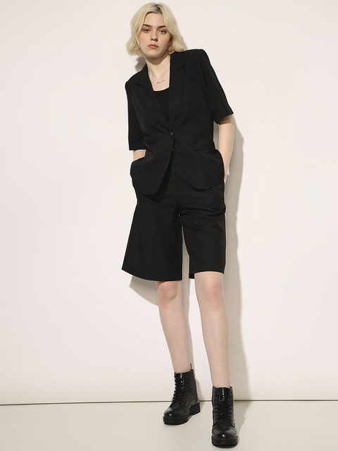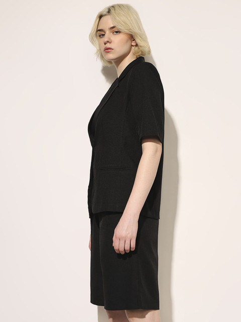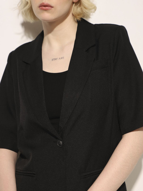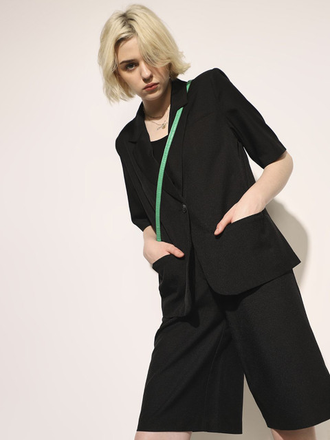 Black solid tailored-fit blazer, has a notched lapel, three quarter sleeves, single-breasted with button closure, two flap pockets, one welt pocket and a single-vented back hem
