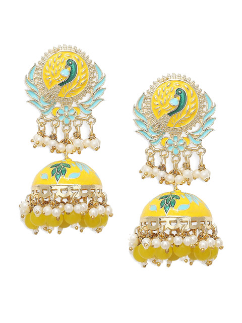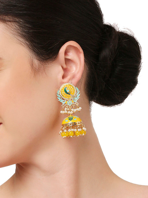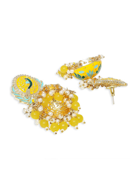Yellow peacock shaped jhumkas, has pearls