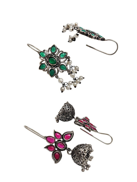 Silver-toned, green and white floral shaped oxidised jhumkas, has artificial stones studded and beaded details