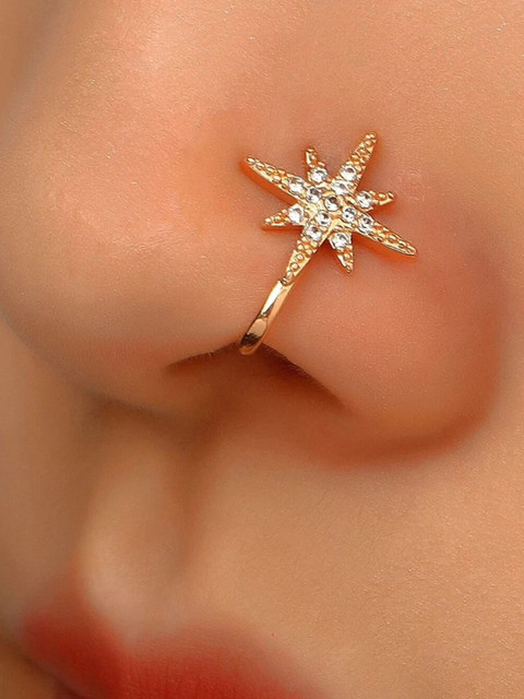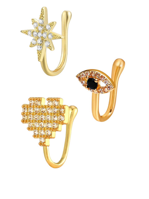 Gold-toned, white and black star, heart & evil eye shaped zircon studded stud nosepin, has insert closure