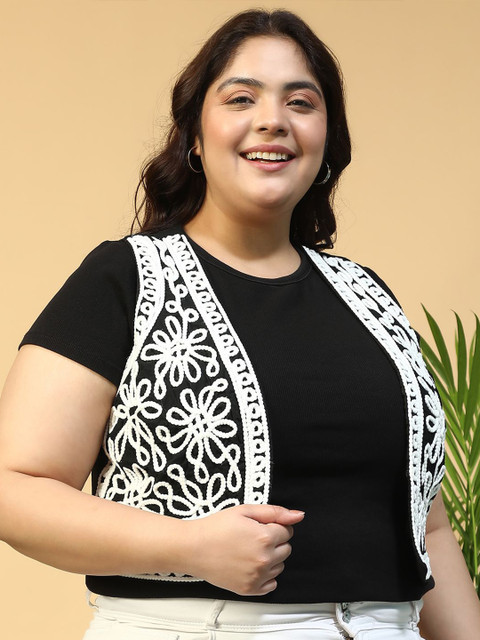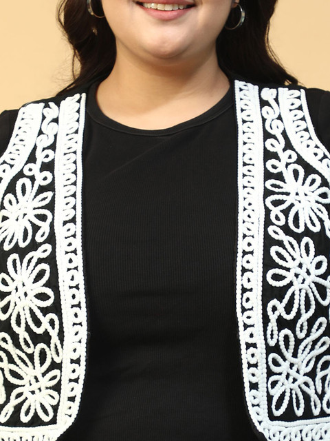 White and black self design open front regular shrug ,has sleeveless, embroidered detail, straight hem