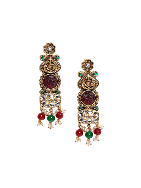 These gold plated drop earrings with Ganeshji design are truly beautiful and unique. The intricate detailing of Lord Ganesh adds a spiritual and elegant touch, making them perfect for festive occasions, pooja, or traditional wear. The gold plating looks shiny and premium, and the earrings feel lightweight on the ears. The hook/closure is secure and comfortable to wear for long hours. They pair well with ethnic outfits and also make a thoughtful gift. Overall, a perfect blend of tradition and style.