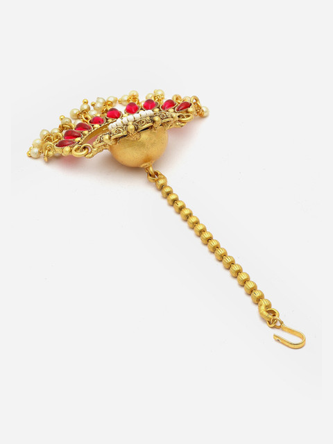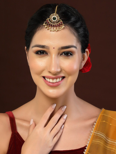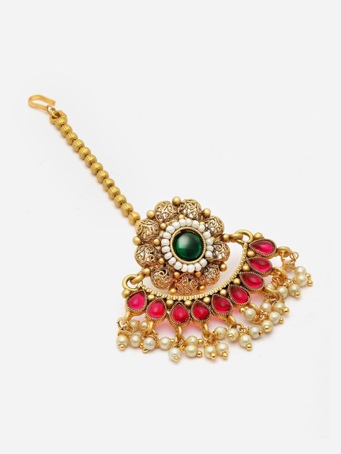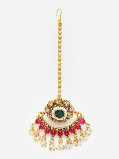 Gold-toned maang tikka, has green and white stone-studded and white pearl-beaded details, gold-plated