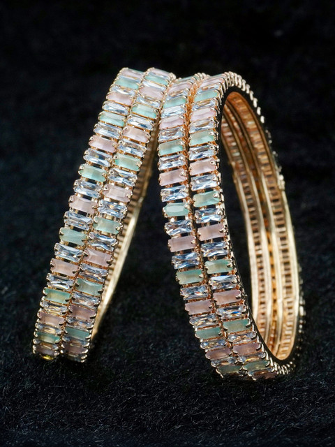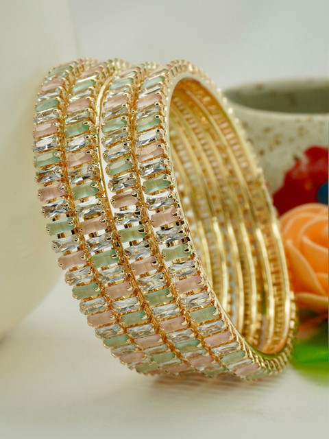 Set of four gold-plated bangles, each has pink and sea-green AD stone-studded details, secured with slip-on closure