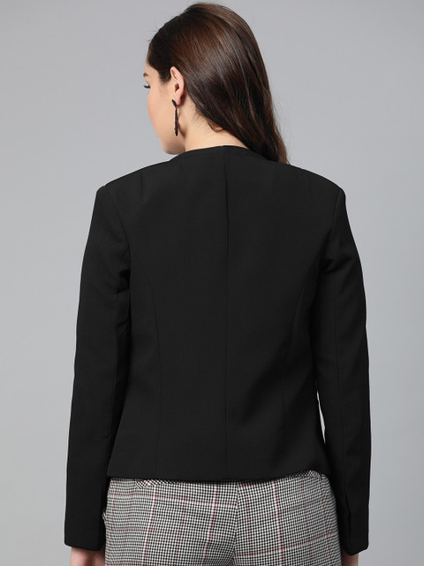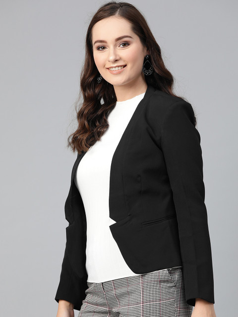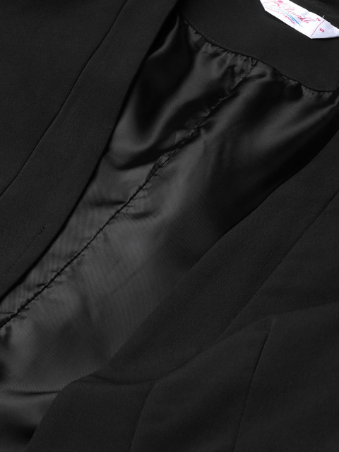 Black solid blazer, has an open front, long sleeves, two mock pockets, and an attached lining