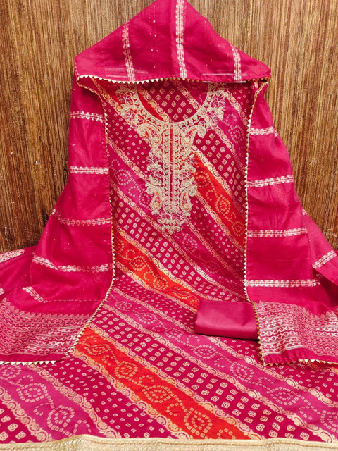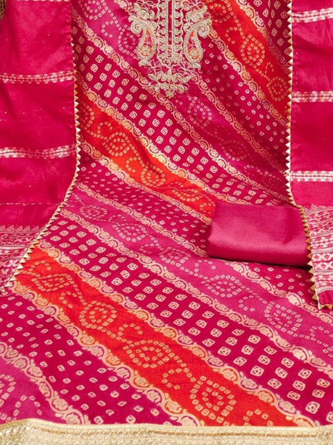 Pink, red and gold-toned bandhani printed unstitched dress material
