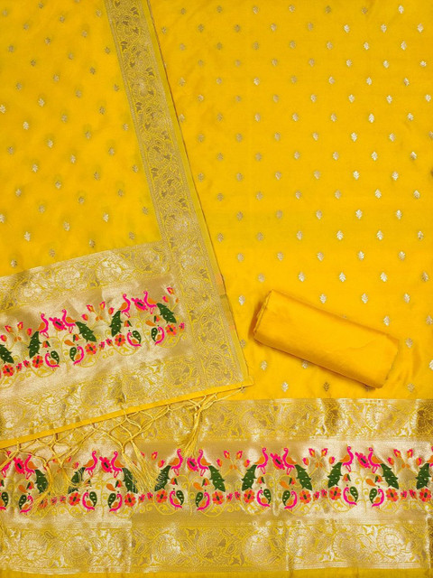 Yellow , gold toned & green ethnic motifs woven design unstitched dress material