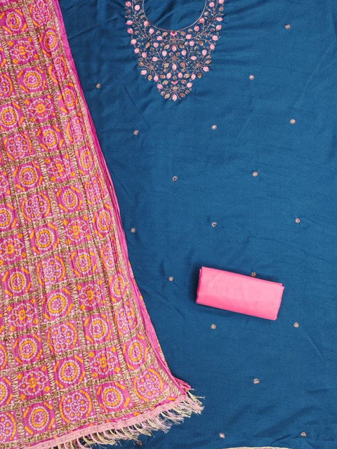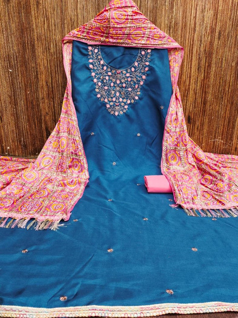 Blue and yellow embroidered unstitched dress material