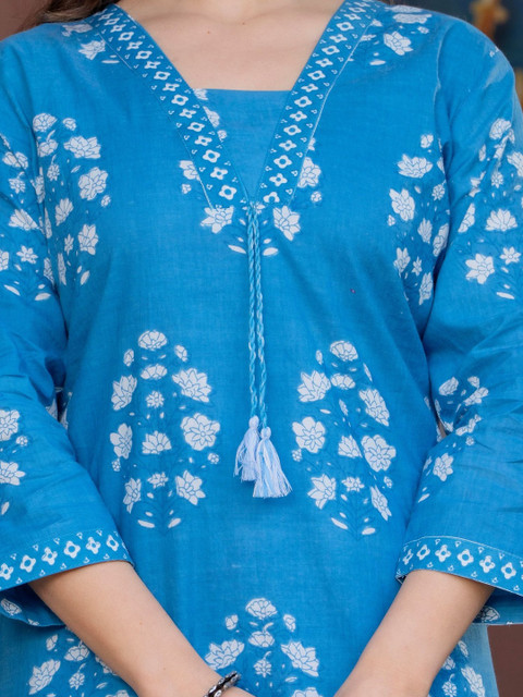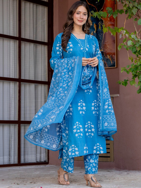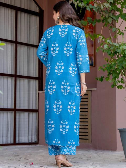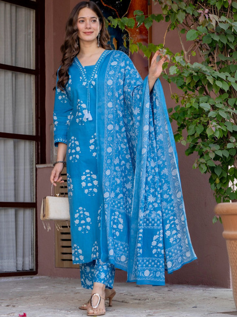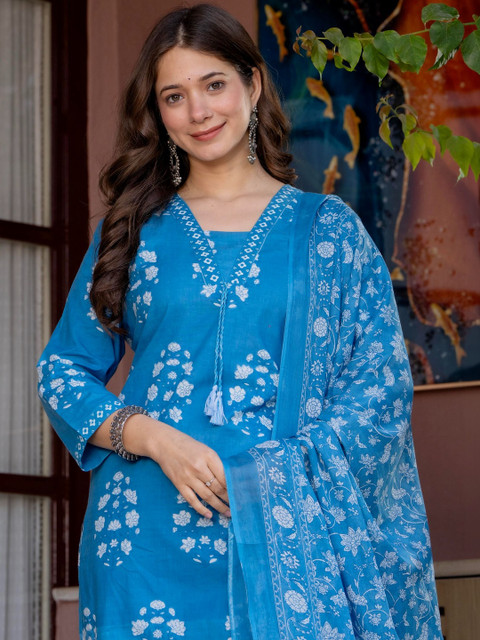 PARTHVI Women’s Pure Cotton Printed Straight Kurta Set with Palazzo Pants & Dupatta- Ethnic Wear, Blue