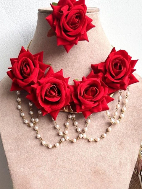 A necklace, has a red and white flowers and pearls beaded details, Secured with a drawstring closure