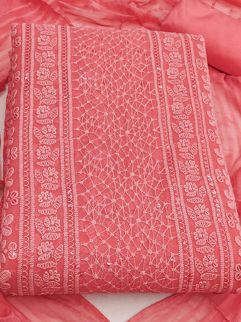 A graceful coral pink unstitched dress material with floral embroidery and subtle sequins, perfect for festive and everyday ethnic wear.