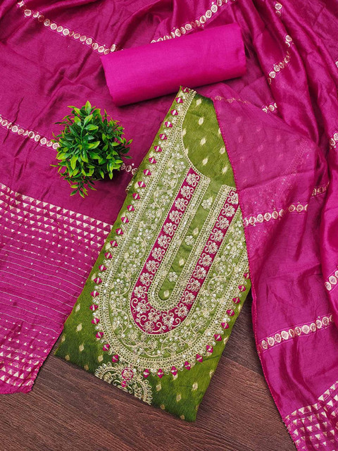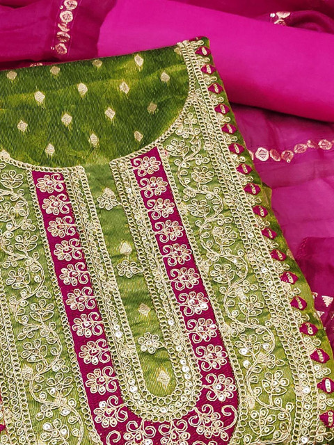 Lime green embroidered unstitched dress material
