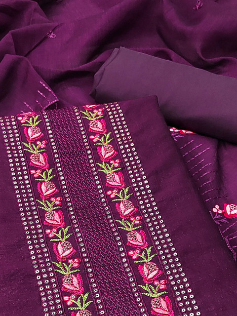 Purple and pink embroidered unstitched dress material