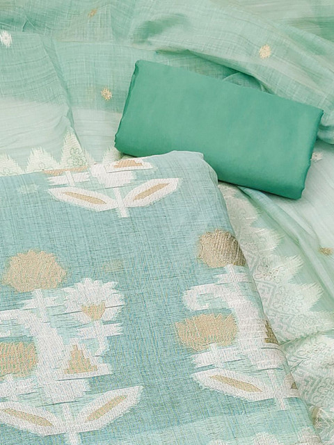 Turquoise blue, gold-toned and white woven design unstitched dress material