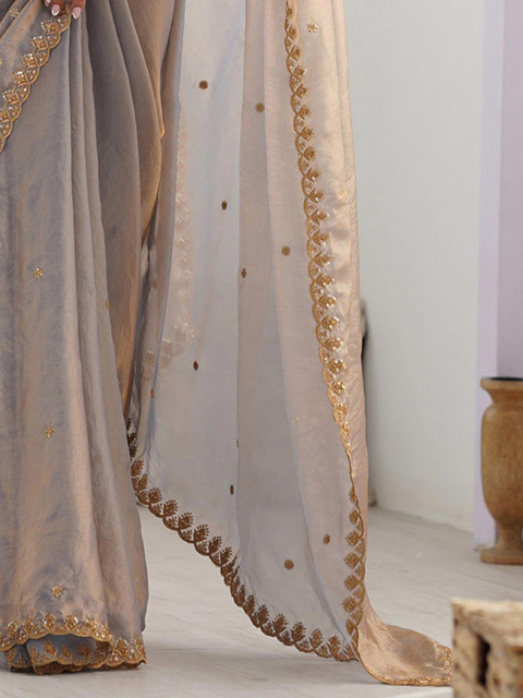 This elegant grey satin saree with floral sequin and zari embroidery offers a lightweight, breathable drape and includes an unstitched blouse piece for a customizable fit, perfect for parties and special occasions.