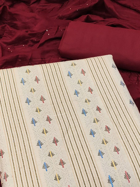 Cream-coloured and maroon woven design unstitched dress material