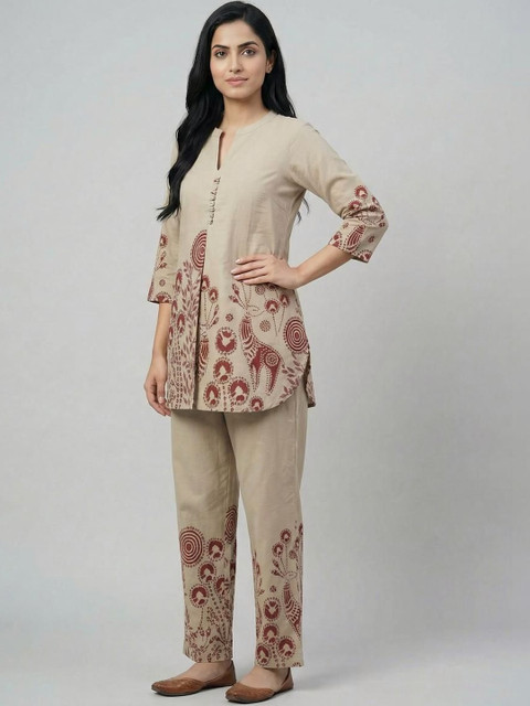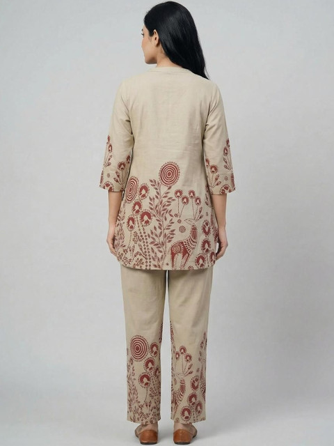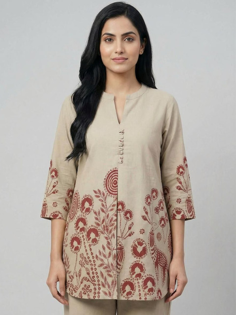 Cream-Colored printed top, has Mandarin Collar neck and long sleeves, secured with button closure