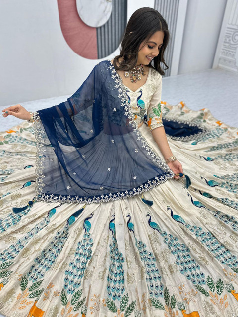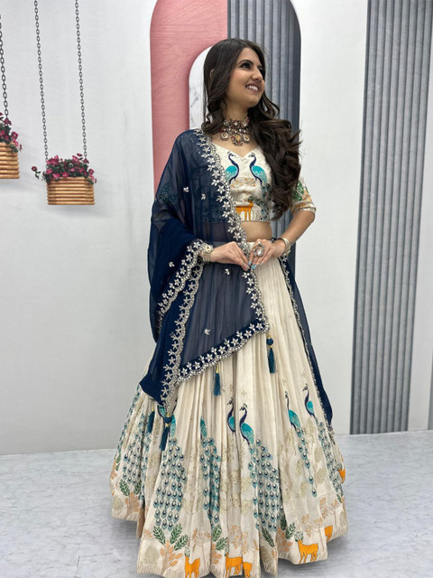Navy blue and cream embroidered lehenga choli with dupatta,