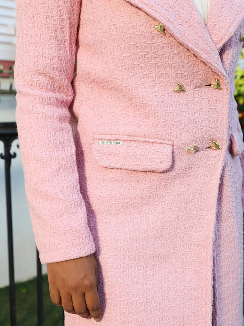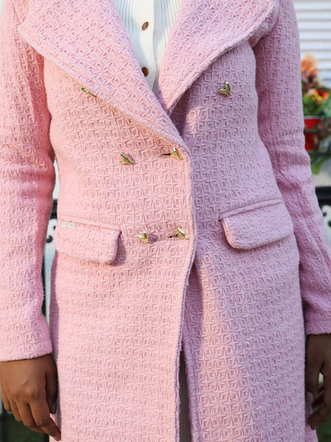 Pink self-designed overcoat, has notch lapel collar, long sleeves, button closure, two pockets, a straight hem