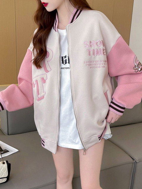 🎀The pink Style Cast varsity jacket is total girly-core perfection. The soft pink shade is absolutely dreamy—like strawberry milk vibes in clothing form. 🌸The blush color is so soft and dreamy, like cotton-candy skies or a perfectly iced pink latte. The typography print adds a cute, playful touch, and the stand collar gives it that clean, polished look that makes every outfit feel extra put-together.