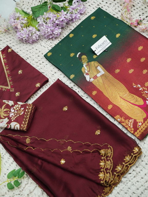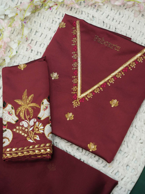 Maroon Embroidered Semi-Stitched blouse, has a V-Neck, Short Sleeves, Maroon Printed Semi-Stitched lehenga, Flared hem