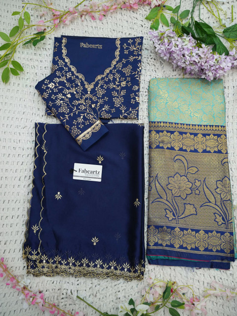 Navy Blue Embroidered Semi-Stitched blouse, has a V-Neck, Short Sleeves, Navy Blue Woven Design Semi-Stitched lehenga, Flared hem