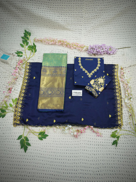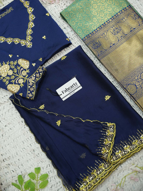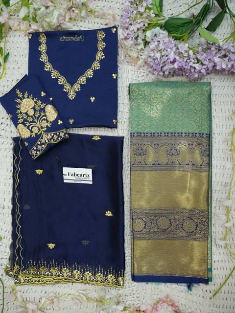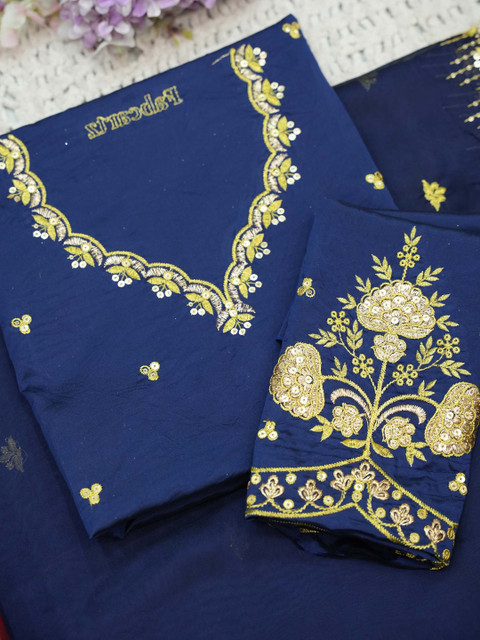 Navy Blue Embroidered Semi-Stitched blouse, has a V-Neck, Short Sleeves, Navy Blue Embroidered Semi-Stitched lehenga, Flared hem