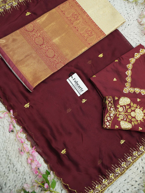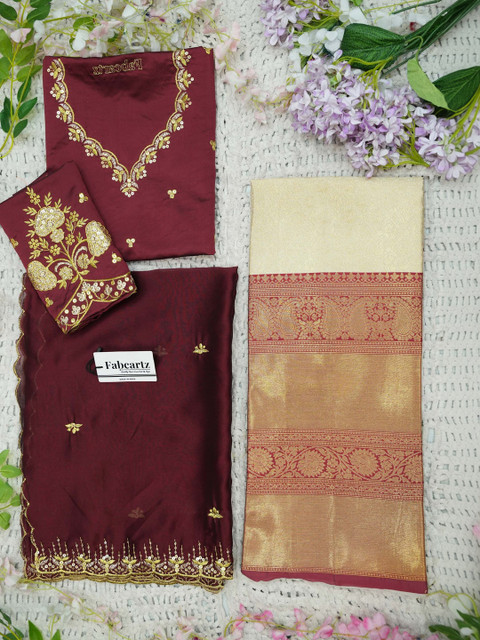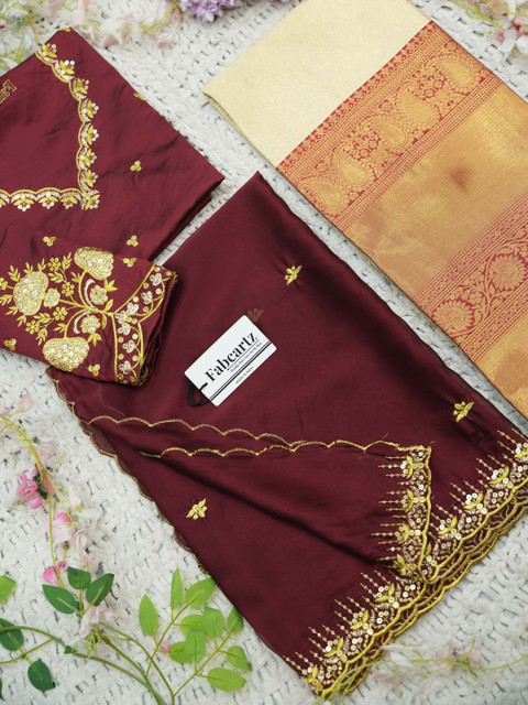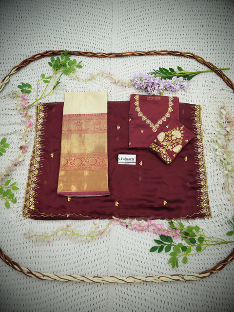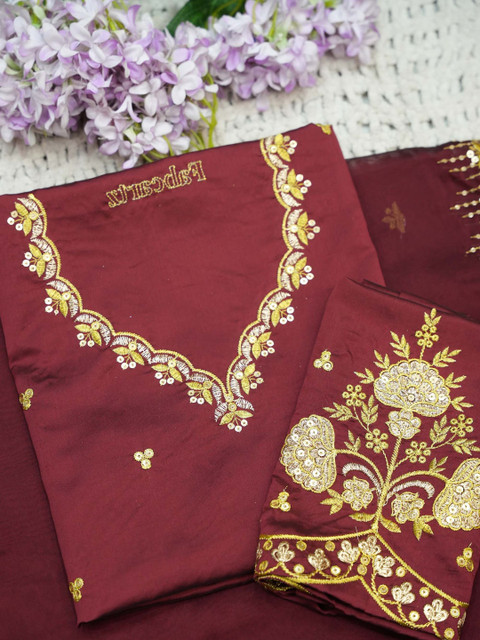 Maroon Embroidered Semi-Stitched blouse, has a V-Neck, Short Sleeves, Maroon Embellished Unstitched lehenga, Flared hem