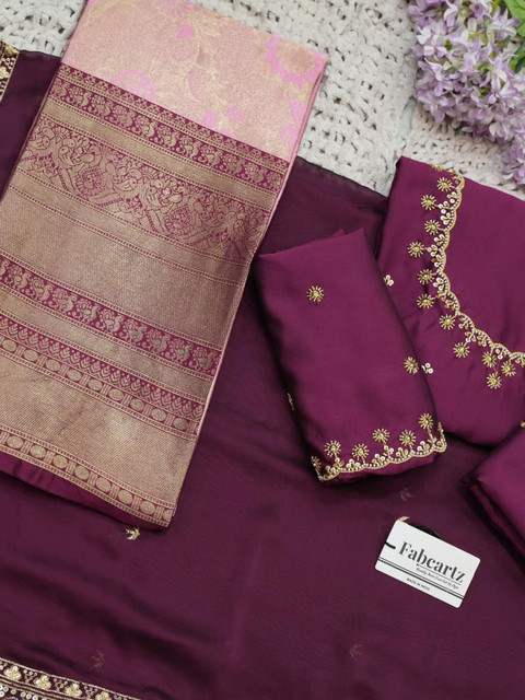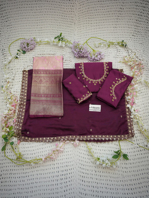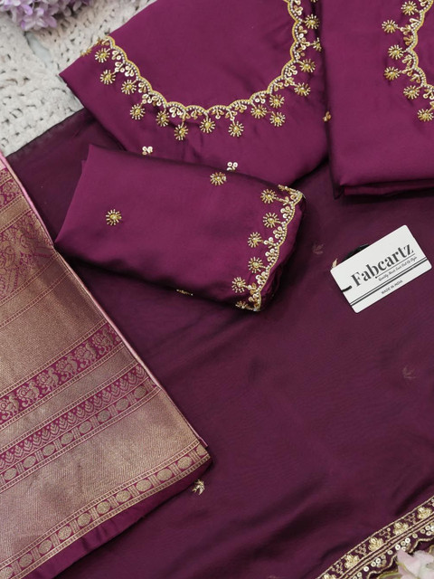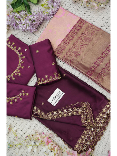 Purple Embroidered Unstitched blouse, has a Round Neck, Short Sleeves, Purple Woven Design Unstitched lehenga, Flared hem